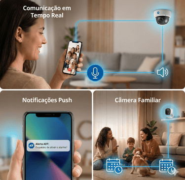 Notificações Push: Alertas imediatos no celular, incluindo lembretes caso você esqueça de ativar o alarme ao sair.